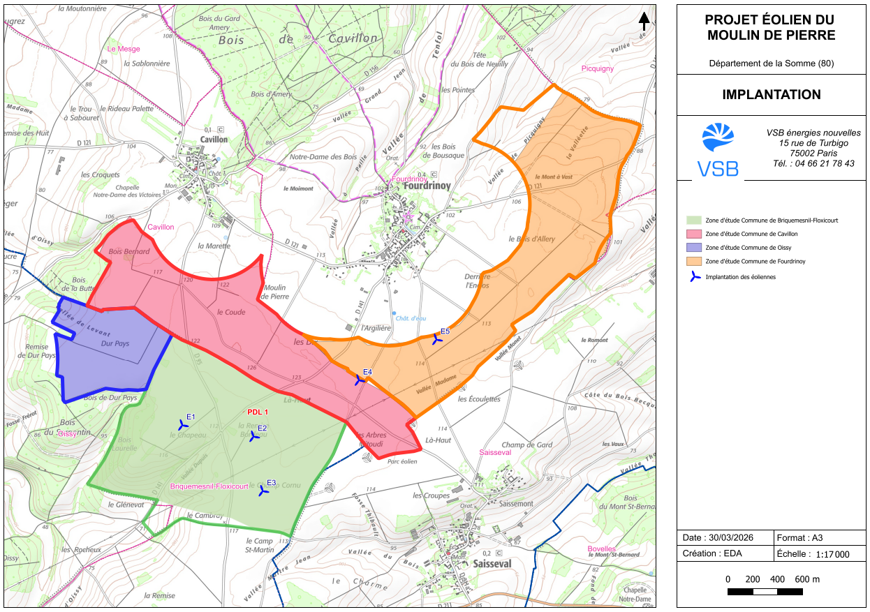Implantation des éoliennes sur les communes de Briquemesnil-floxicourt, Cavillon et Fourdrinoy